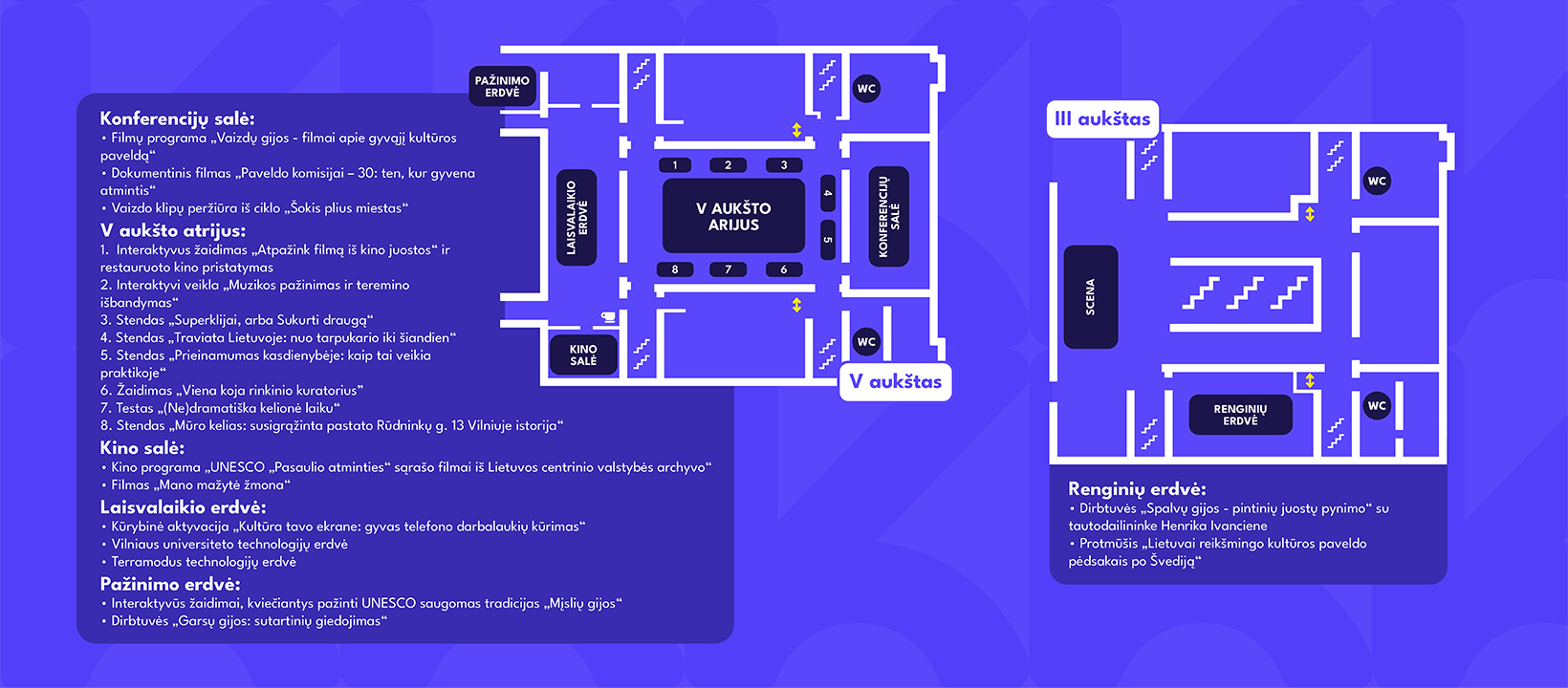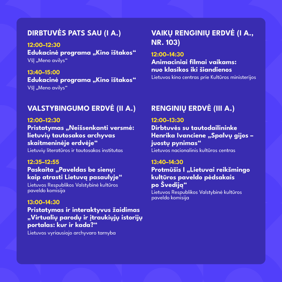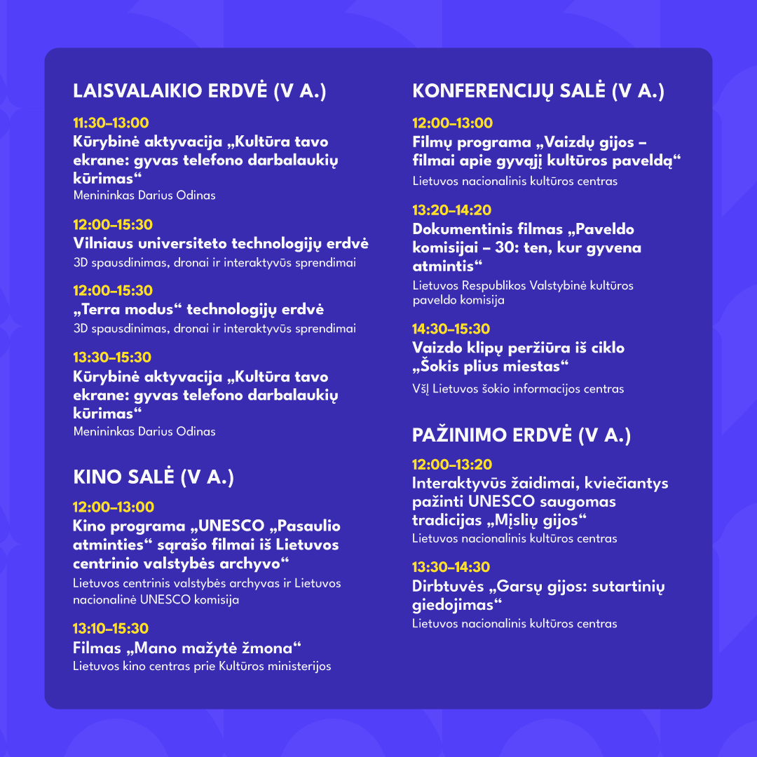 - 12.00–13.20 val. Mįslių gijos. Interaktyvūs žaidimai, skirti pažinti į UNESCO sąrašus įrašytas tradicijas (Pažinimo erdvė (Laimės Lukošiūnienės salė), V a.)