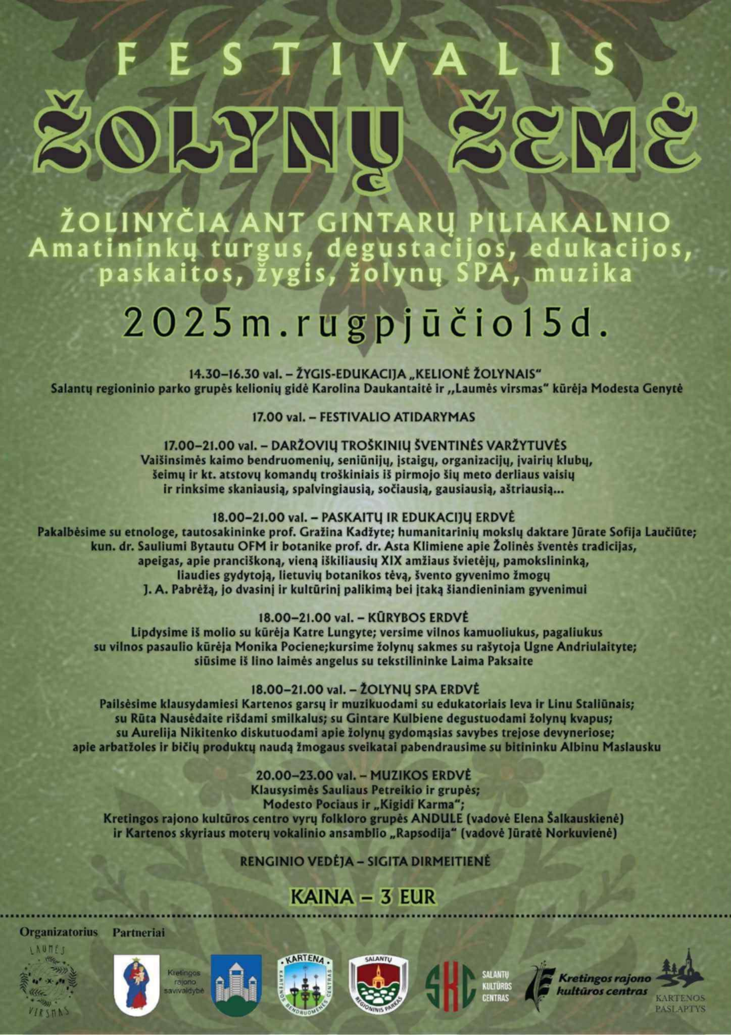 Pailsėsime klausydamiesi Kartenos garsų ir muzikuodami su edukatoriais Ieva ir Linas Staliūnais; su žoliautoja Rūta Nausėdaite rišdami smilkalus; su žoliautoja Gintare Kulbiene degustuodami žolynų kvapus; su žoliautoja Aurelija Nikitenko diskutuodami apie žolynų gydomąsias savybes bei arbatžoles ir bičių produktų naudą žmogaus sveikatai su bitininku Albinu Maslausku