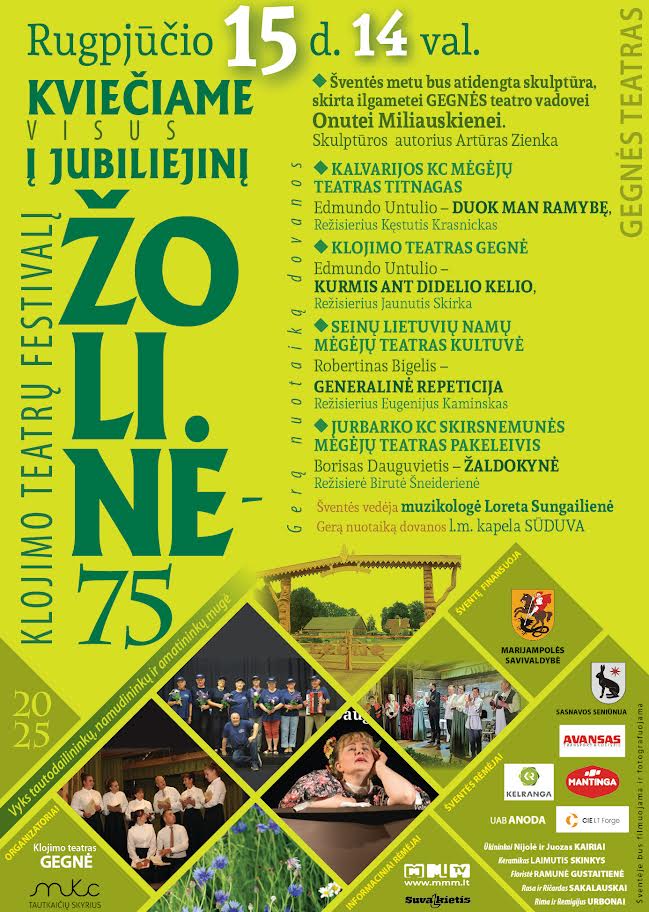 Šiais metais kviečiame į išskirtinę šventę – jubiliejinį Klojimo teatrų festivalį „Žolinė – 75“! Tai ilgametė tradicija, sujungianti teatrą, istoriją, bendrystę ir Žolinės dvasią.