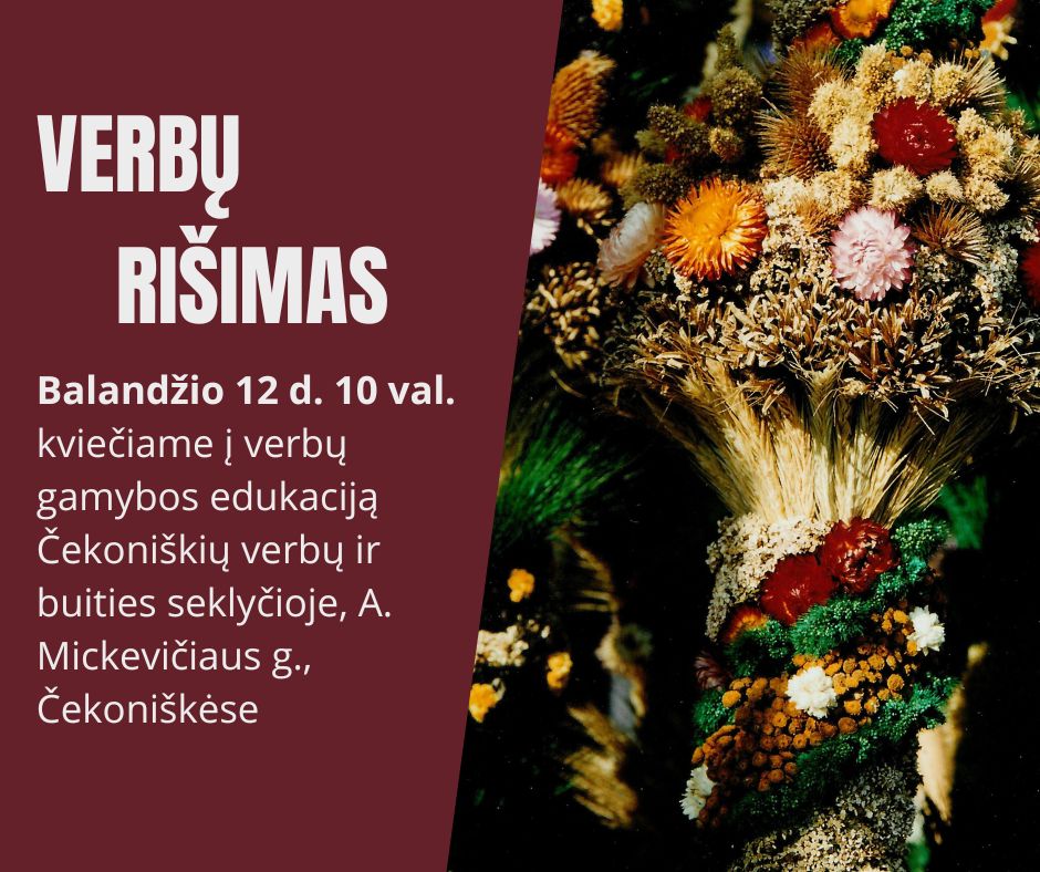 Balandžio 12 d., šeštadienį, 10 val. Neries regioninis parkas kartu su Čekoniškių kaimo verbų ir buities seklyčia organizuoja verbų pynimo edukaciją. Edukacijos metu amatininkės demonstruos tradicinį verbų pynimo būdą, supažindins su verbų pynimo tradicijomis. Dalyviai patys pasirinktinai pasigamins volelines arba plokščiąsias verbas.