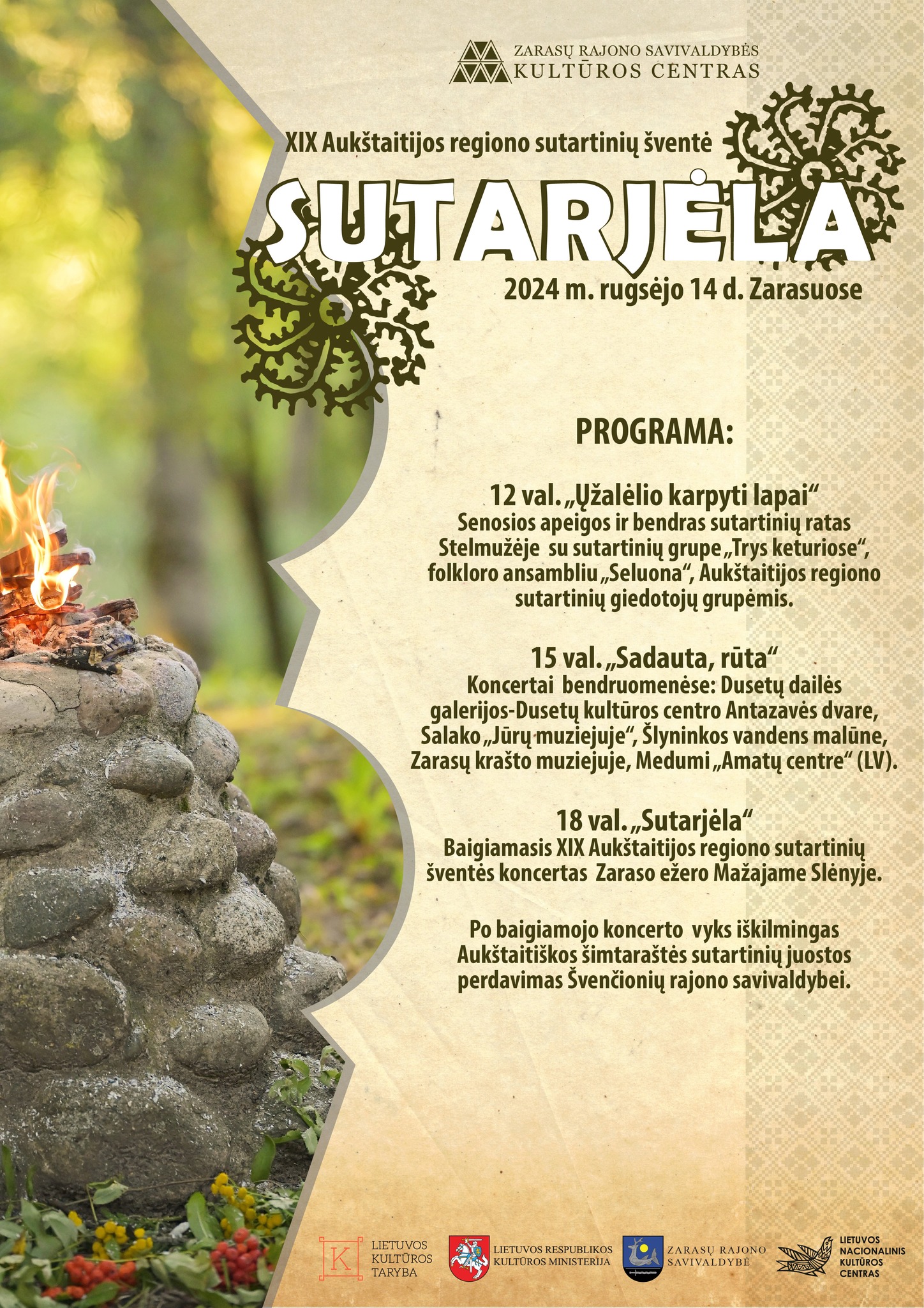 18.00 val. Baigiamasis XIX Aukštaitijos regiono sutartinių šventės koncertas „Sutarjėla“ Zaraso ežero Mažajame Slėnyje.